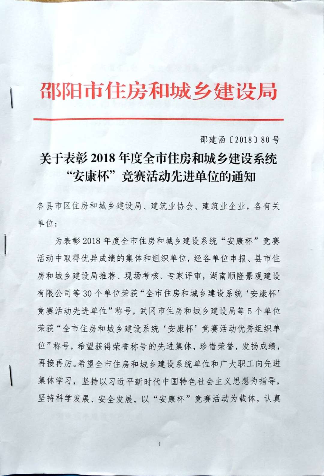 2018年11月20日,我司在2018年度全市住房和城乡建设系统“安康杯”竞赛活动中荣获“先进单位”称号。