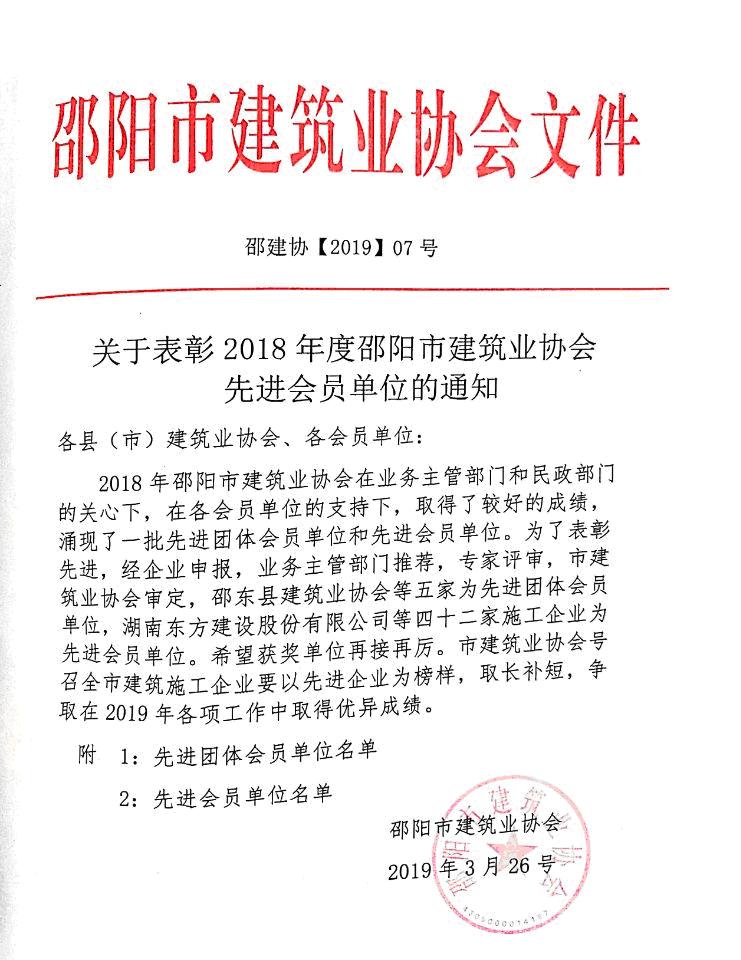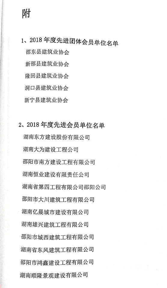 2019年3月26日,从邵阳市建筑业协会再次传来喜讯,我司荣获2018年度先进会员单位荣誉称号。